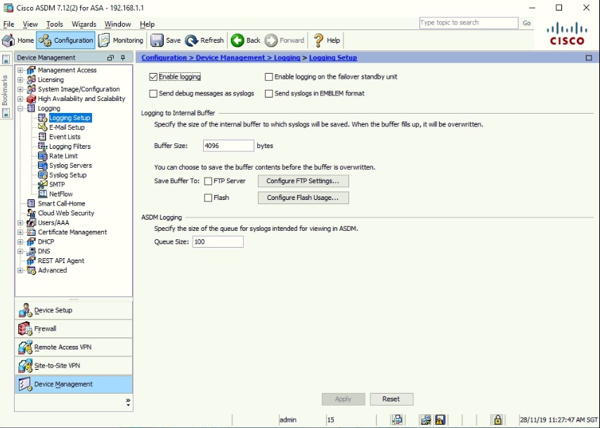 Syslog on the ASA under Configuration > Device Management > Logging >
